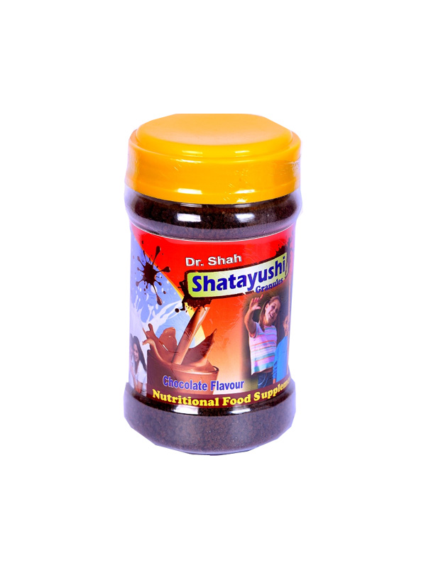 In the under developing countries, one third of the children between age group 2-10 years are undernourished. They are failure to thrive i.e their height and weight are considerably less as compared to standard weight and height chart. Parents are less aware about their growth and development as they have less knowledge and illiteracy about nutrition. Considering this facts, “SHATAYUSHI GRANULES” is a unique herbal product developed by Dr’ Shah and made available after several trials and research. “SHATAYUSHI GRANULES” is a natural product containing valuable herbs like Shatavri, Ashwagandha, Shankapushpi, Brahmi. SHATAYUSHI is nutritional food supplement which increases the immunity power i.e immunobooster, good appetizer and reduces the stress level in the current scenario,As SHATAYUSHI contains ‘Ashwaghandha’ which is recommended by AYUSH in the present scenario. It is 100% natural organic product free from soyapowder, milk powder, custard powder with no added artifical colours, essence, preservatives. Its recommended dose is 5-10 gm morning and evening along with warm milk daily